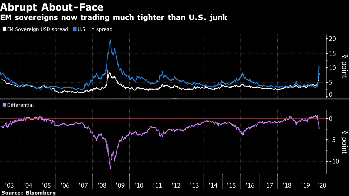 在2020年初,美国高收益债券处于创纪录的交易状态,交易价格低于新兴市场主权美元债券——尽管美国垃圾债券的信用评级平均较低。