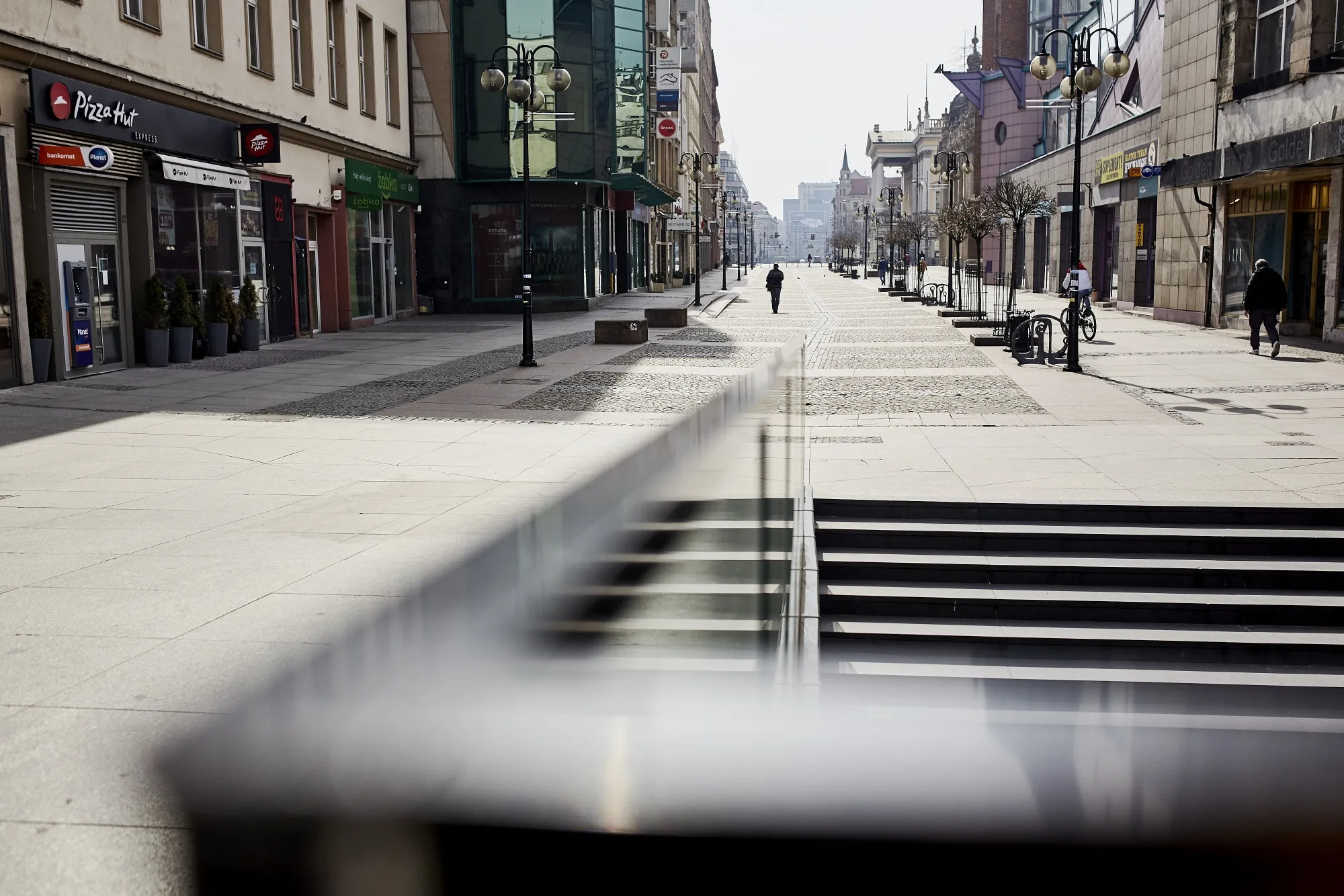 行人经过波兰弗罗茨瓦夫的营业食品摊位和关闭的零售店,时间是3月27日。