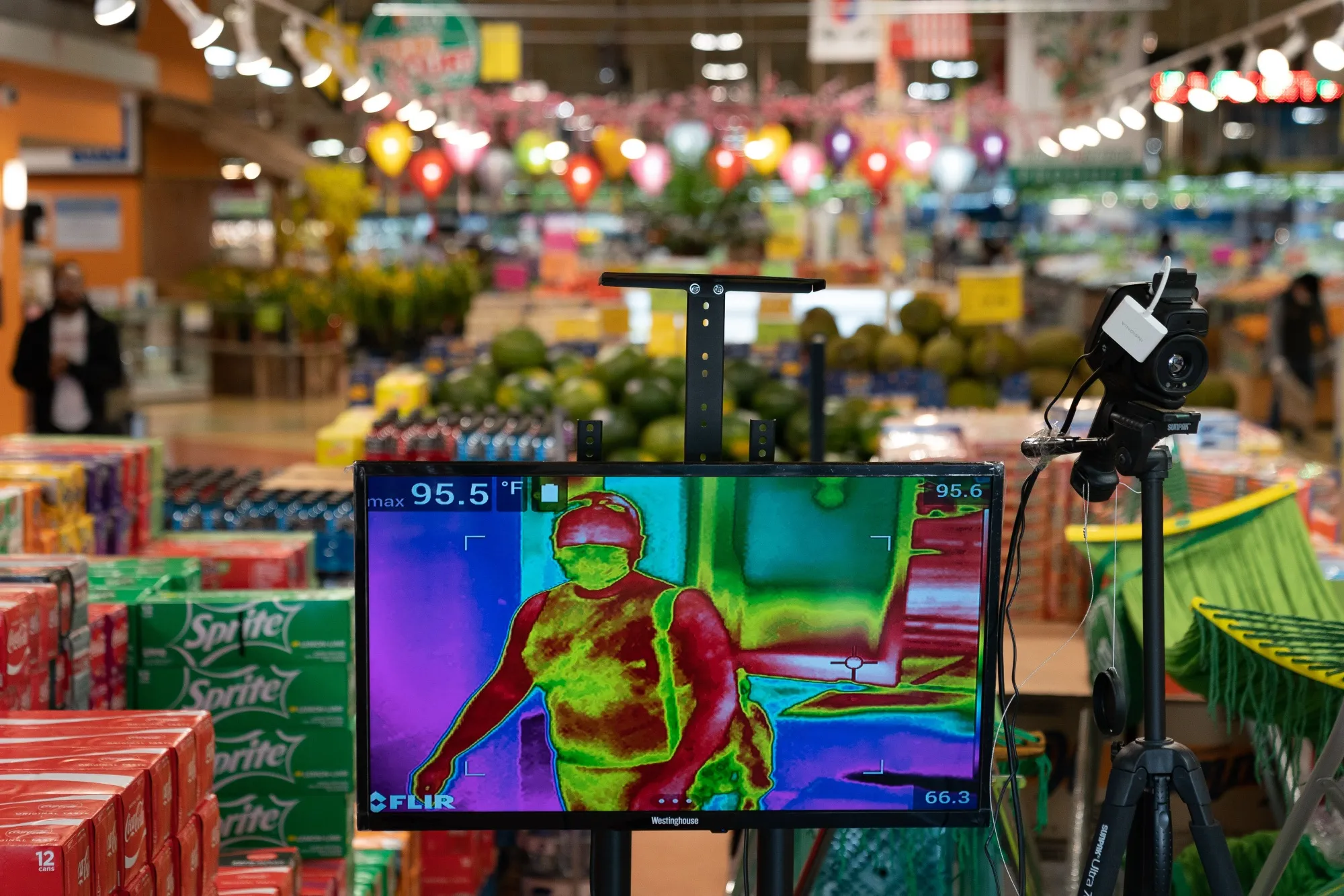 一台热成像相机在乔治亚州达卢斯的超市入口处记录顾客的温度,时间是3月26日。