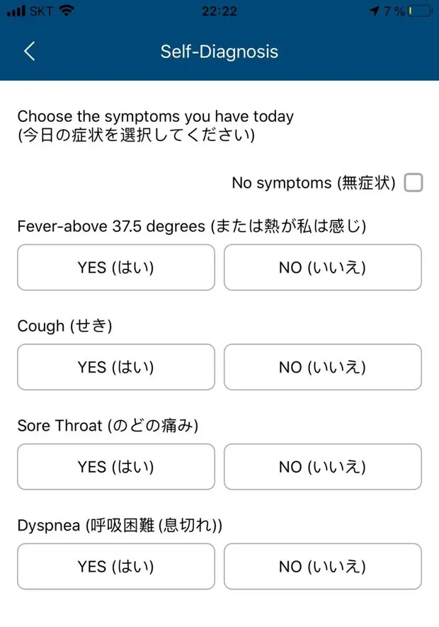 韩国应用程序入境旅客必须在手机上安装的自我诊断屏幕。感谢Charlène Flores但总体而言,当被问及时,人们一直在遵守规则:“偶尔会有逃跑的情况,但主要是他们在遵守,”Chan说。