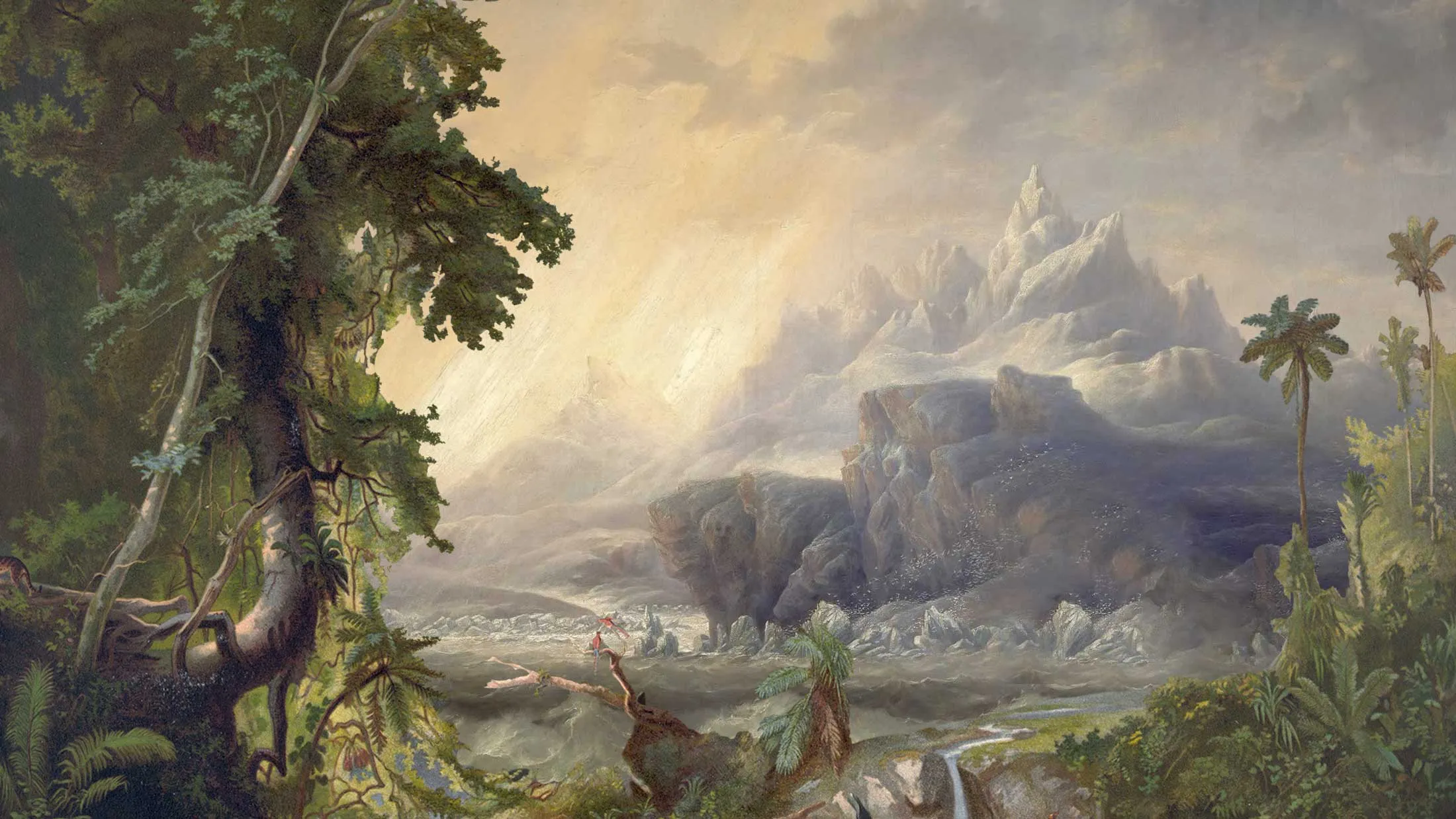 研究人员委托制作了一幅关于雨林化的南极可能样子的插图,包括基于化石根系、花粉和孢子的植物,以及背景中的冒烟火山:这是对长期存在的假说的致敬,该假说认为大量火山喷发的二氧化碳将气体的浓度提高到工业化前基准的四到六倍。(今天的变暖是由人类活动引起的,而不是火山。)