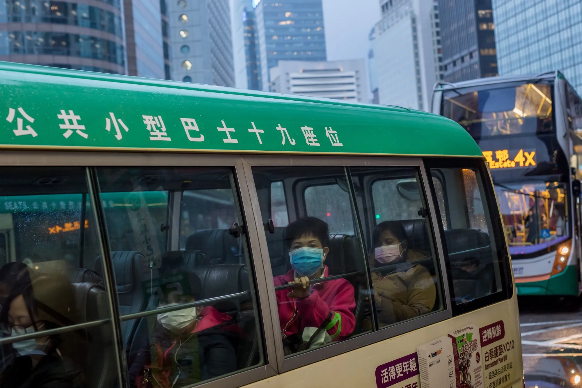 2月11日,香港中区的乘客戴着口罩坐在小巴上。