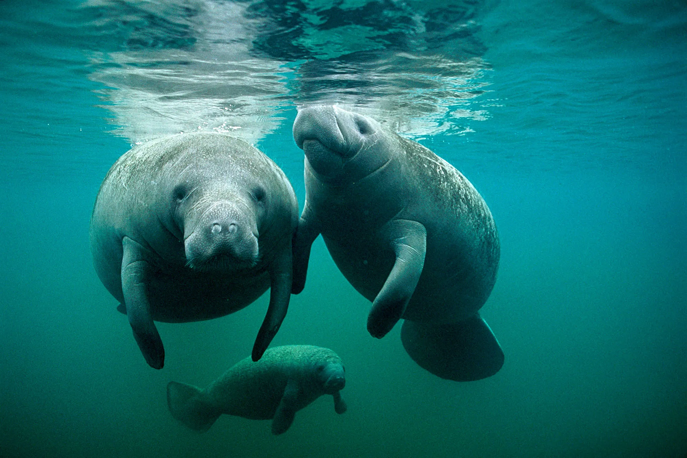 海牛是海洋中胖乎乎的素食嬉皮士。既不是捕食者也不是猎物,世界上剩下的三种物种都被认为是脆弱的,包括西印度海牛(Trichechus manatus),佛罗里达海牛是其亚种。海牛似乎几乎进化得对达尔文的斗争免疫。它们脑容量小,极度远视,几乎失聪,几乎无法嗅到气味——实际上是由桨状尾巴推动的漂浮消化机器。它们主要以海草为生,100到200磅的海草在某一时刻正在海牛的肠道系统中消化。它们的肺部延伸到整个躯干的长度,帮助它们保持最佳的浮力,以便像在三叶草田里吃草的泽西牛一样进食。然而,尽管海牛是静止的目标,甚至鲨鱼也不愿意靠近它们,对这种尽管肥胖却缺乏美味绝缘层的动物毫无兴趣。海牛如此镇定,以至于一只野生海牛会翻身,让它唯一真正的捕食者——我们——抚摸它柔软的腹部。