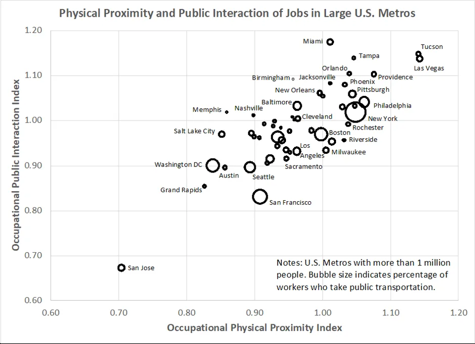 另一方面,像旧金山湾区、华盛顿特区、奥斯汀和西雅图这样的科技中心,工人在与公众密切接触或需要身体接近的职业中的比例要小得多。注意它们在上面图表的左下角聚集。尽管常常说高科技工作需要高程度的面对面互动,但圣荷西都市区——硅谷的真正核心——在需要工人直接身体接触的职业中占比最低(不到20%),在需要与公众直接互动的职业中占比也最低(16%)。看看它在图表左侧的距离有多远。