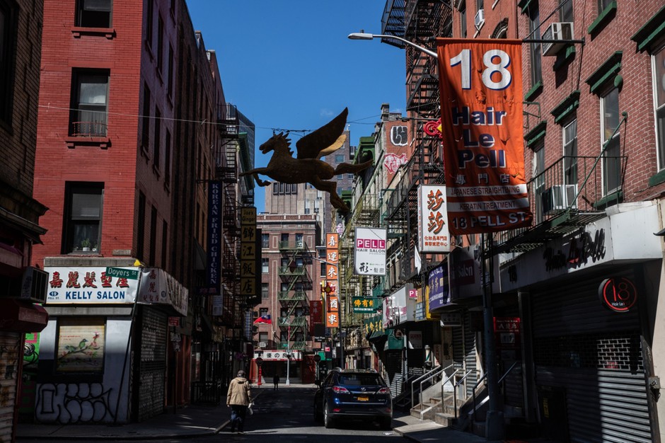 一名行人在曼哈顿华埠的近乎空荡荡的多耶街上走过,时间是4月6日。Jeenah Moon/Bloomberg即使旧金山居民被命令待在家中,Max Leung和一群志愿者仍定期在华埠街头巡逻。他们轮班,分成两三人一组,开车和步行巡逻,并保持至少六英尺的距离。