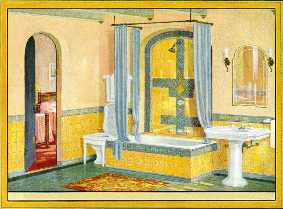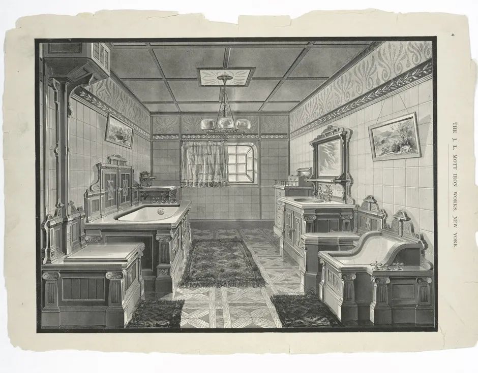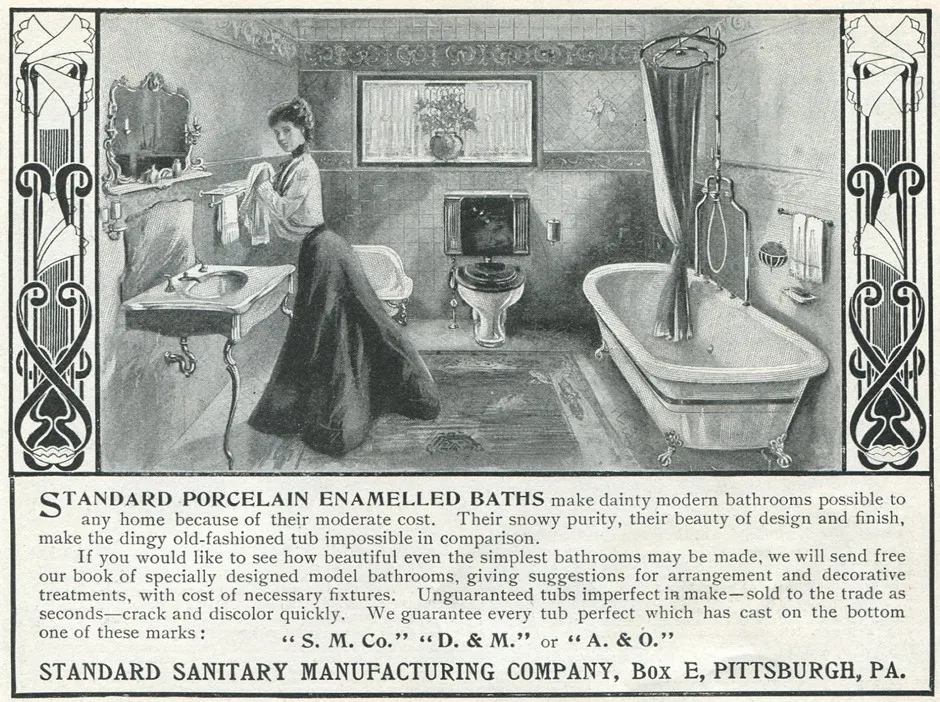 来自标准卫生制造公司的 1912年的销售小册子(后来更名为美国标准)封面展示了追溯到1875年的美国浴室的图示。尽管两间房间的设计之间仅相隔37年,但它们截然不同:前者覆盖着木材,而后者与我们今天所知的浴室并没有太大区别。“几年前显然还不为人知的卫生和卫生观念,如今已深深植根于我们的日常生活中,”小册子上写道,“以至于如果我们出于任何原因被迫放弃它们,我们会觉得自己已经倒退了几个世纪,而不是仅仅二十五到五十年,这段时间内现代卫生和卫生观念才得以形成。”