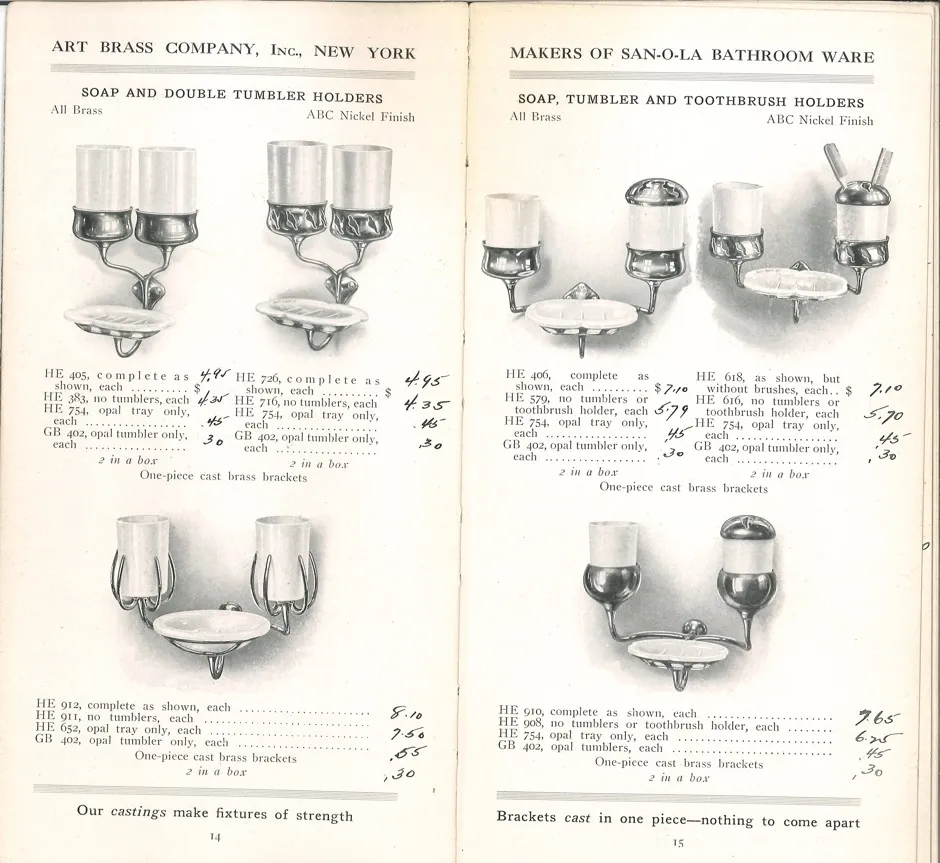 浴室配件如肥皂碟、牙刷架、毛巾杆和杯架是家庭浴室理想无菌外观的另一个关键组成部分。“20世纪初的浴室和厨房有一种‘实验室’的特质……镀镍黄铜浴室配件在其中扮演了重要角色,”沙利文说。镀镍工艺在1880年代作为一种模仿银的高档门硬件饰面出现,但到了1890年代,它迁移到了厨房和浴室,成为一种不易氧化且易于清洁的实心黄铜配件处理方式。与当时许多其他家居产品一样,这些配件在医院中也不会显得格格不入。纽约的艺术黄铜公司还以“San-o-la”的名义出售他们的产品,以利用这种卫生设计热潮。该San-o-la 产品不仅实用——它们的一体铸造设计易于清洁——还具有受新艺术风格影响的流畅造型,为原本简单而无菌的空间增添了一丝魅力。