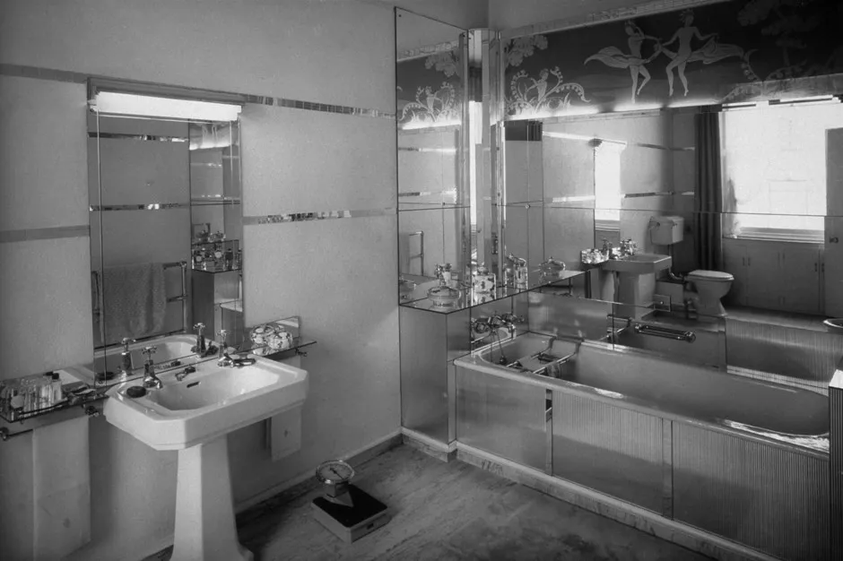 但无论是战间期建造和设计的浴室是极简主义还是华丽的装饰艺术,必须易于清洁和尽可能卫生的理念仍然存在——至少在一段时间内。一旦抗生素变得普遍,设计不再有促进疾病避免的责任,其他趋势便出现了——看看70年代带有毛绒马桶座套的地毯浴室的流行。