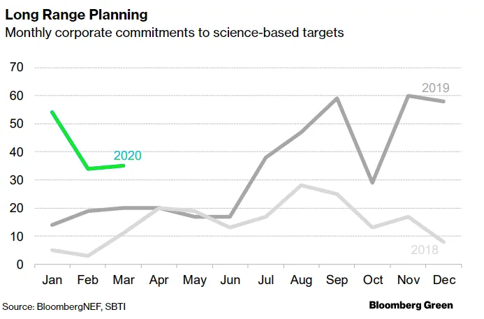 但是,尽管许多人预测以绿色为重点的改革将在各国努力恢复时被搁置,但迄今为止对此的证据较弱。允许公司购买自己风能和太阳能的采购协议在三月份略有上升,签署的协议达到2.4吉瓦,高于去年同期的2.1吉瓦。(当然,BloombergNEF警告说,随着交易的拖延,活动可能会放缓。)公司继续设定基于科学的减排目标,以符合《巴黎协定》。今年有超过100家公司设定了这样的目标,较2019年同期的53家有所增加(尽管三月份的承诺速度放缓)。