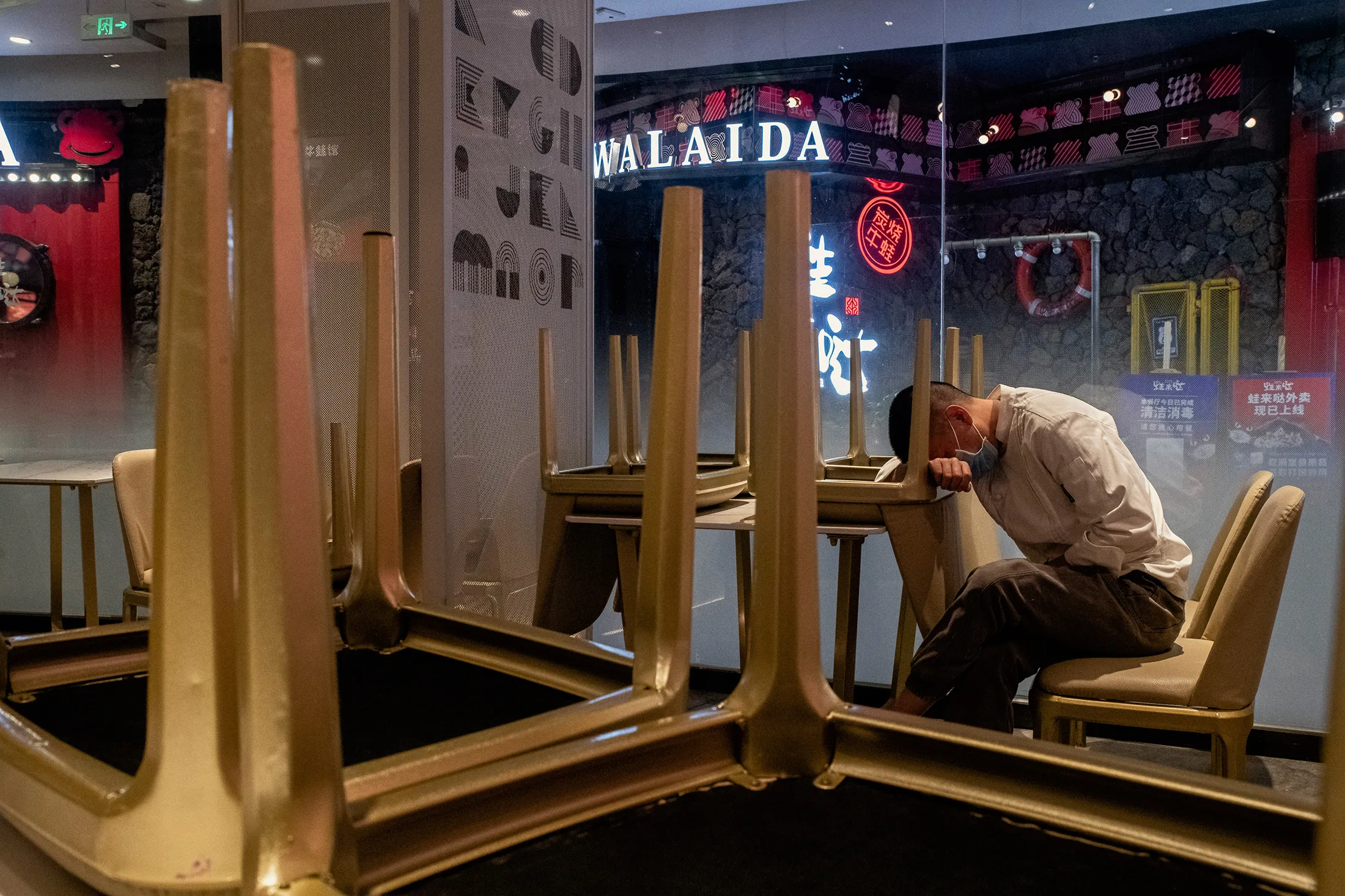 一位厨师在打盹。由于疫情,餐厅仅提供外卖服务。摄影师:Gilles Sabrie 为彭博商业周刊在疫情爆发前,熊的公司,百年丰餐饮管理有限公司,经营的10家餐厅中,没有一家重新开放堂食。虽然有三家餐厅已恢复外卖,但熊已经决定永久关闭另外三家,因为他预计顾客会减少。现在,这位40岁的企业家和他的商业伙伴正在努力决定长期的计划。百年丰的一半餐厅是火锅店,顾客在共同的锅中煮生肉和蔬菜——这种地方顾客现在可能会避免。“消费将会大幅下降,”熊说,预测这座城市的餐饮行业将会经历洗牌。