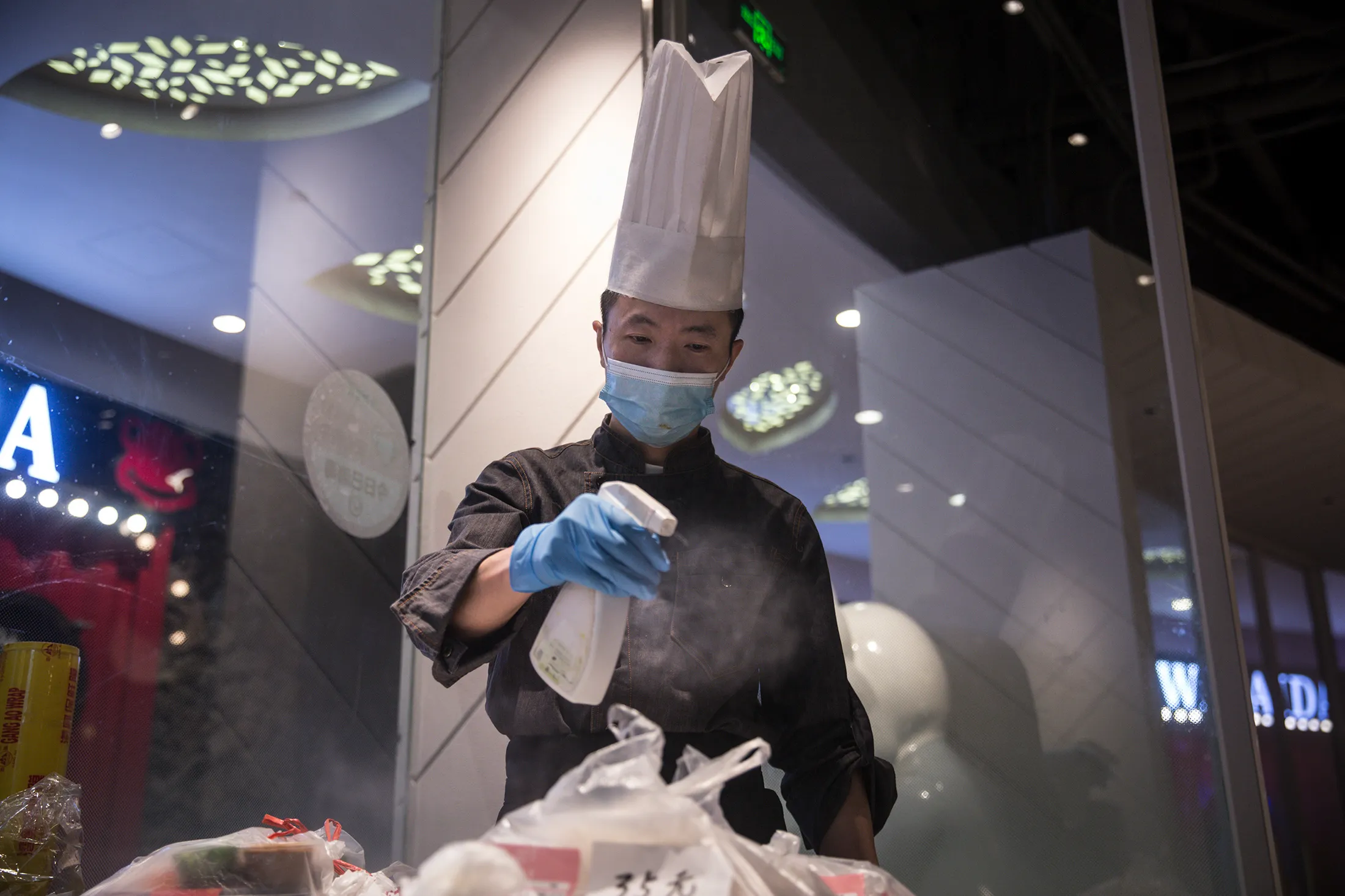 一位厨师在包装食品上喷洒酒精。摄影师:彭博社随着隔离的开始,百年丰像来自纽约到悉尼的餐饮业者一样,寻求 外卖服务的庇护。但 武汉一夜之间变成了鬼城,熊不得不想办法采购和运输随着供应减少而变得越来越昂贵的食材。与此同时,他的员工——因为大多数人太害怕上班或被限制离开居住区而大幅减少——在他在封锁期间设法保持开放的那家餐厅中花费了大量时间进行厨房消毒。
