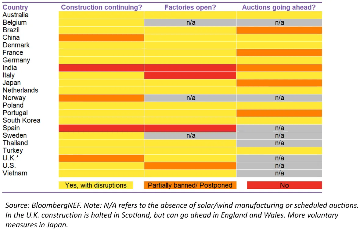 根据彭博新能源财经的说法,即使在大多数国家施工继续进行和工厂保持开放的情况下,大多数风能和太阳能项目也将面临延迟。虽然大多数政府并未强制关闭施工或工厂,但其他问题带来了挑战。由于旅行限制导致的劳动力短缺、许可证发放的延迟、融资困难以及其他供应链短缺正在拖延项目。此外,许多国家的拍卖已被推迟,之前轮次获胜者的投产截止日期也在延长。在运营方面,旅行限制使得团队难以到达现场。