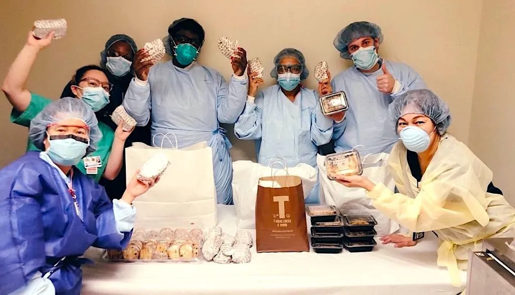 **8. 送货机器人正在帮助杂货店和餐馆在疫情期间保持营业。**这些机器人可以在4英里半径内移动,并通过智能手机进行无接触送货监控。**9. 这些高科技头盔正在帮助当局检测新冠病毒。阿联酋的当局正在使用智能头盔检测体温,以识别感染病毒的人。10. 纽约市餐馆老板卢卡·迪·皮耶特罗动员家人向医务工作者提供免费餐食。**在不得不裁员95名员工后,迪·皮耶特罗表示,这一举动帮助他“在这些疯狂的时刻找到目的”——并开始重新雇佣员工。