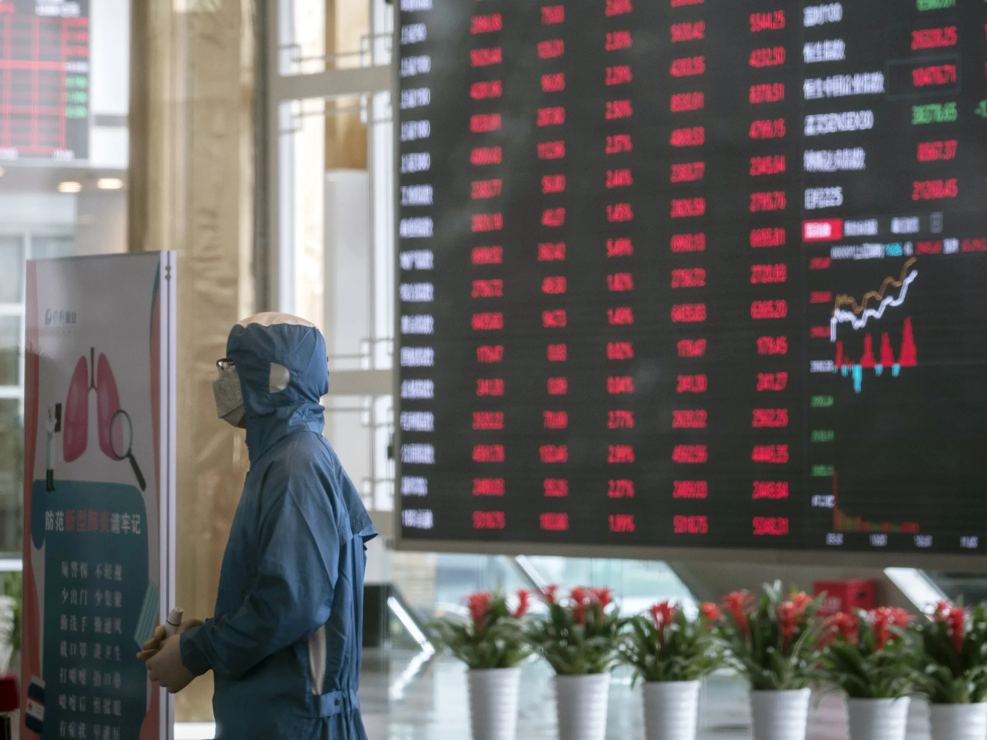 一名穿着防护服的工人在上海证券交易所的温度筛查点站着,时间是3月2日。