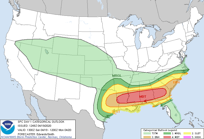 连续第二个星期天,龙卷风、雷暴、洪水和冰雹将袭击南方,最严重的情况将从路易斯安那州蔓延到乔治亚州,这一地区上周遭受了最严重的破坏。总的来说,几乎有1230万人从东德克萨斯州到北卡罗来纳州南部的大西洋海岸处于危险之中。根据美国的说法,这些致命的风暴可能会从什里夫波特袭击到萨凡纳。风暴预测中心。虽然风暴袭击休斯顿、亚特兰大或新奥尔良的可能性较小,但这种可能性仍然存在。此外,特别是在密西西比州到乔治亚州之间,随着警报的发布,闪电洪水的威胁将在当天晚些时候上升。本周风暴的不同之处在于,东北部和中大西洋地区可能会幸免于难。“人们今天应该关注天气;有可能出现龙卷风和闪电洪水的可能性,”马里兰州大学公园的美国天气预测中心的预报员拉拉·帕加诺说。一周前,至少有30人在龙卷风、雷暴引发的强风和冰雹袭击南方时遇难。这些风暴在周一持续,向东海岸移动,导致超过130万用户停电,损害一直延伸到缅因州。