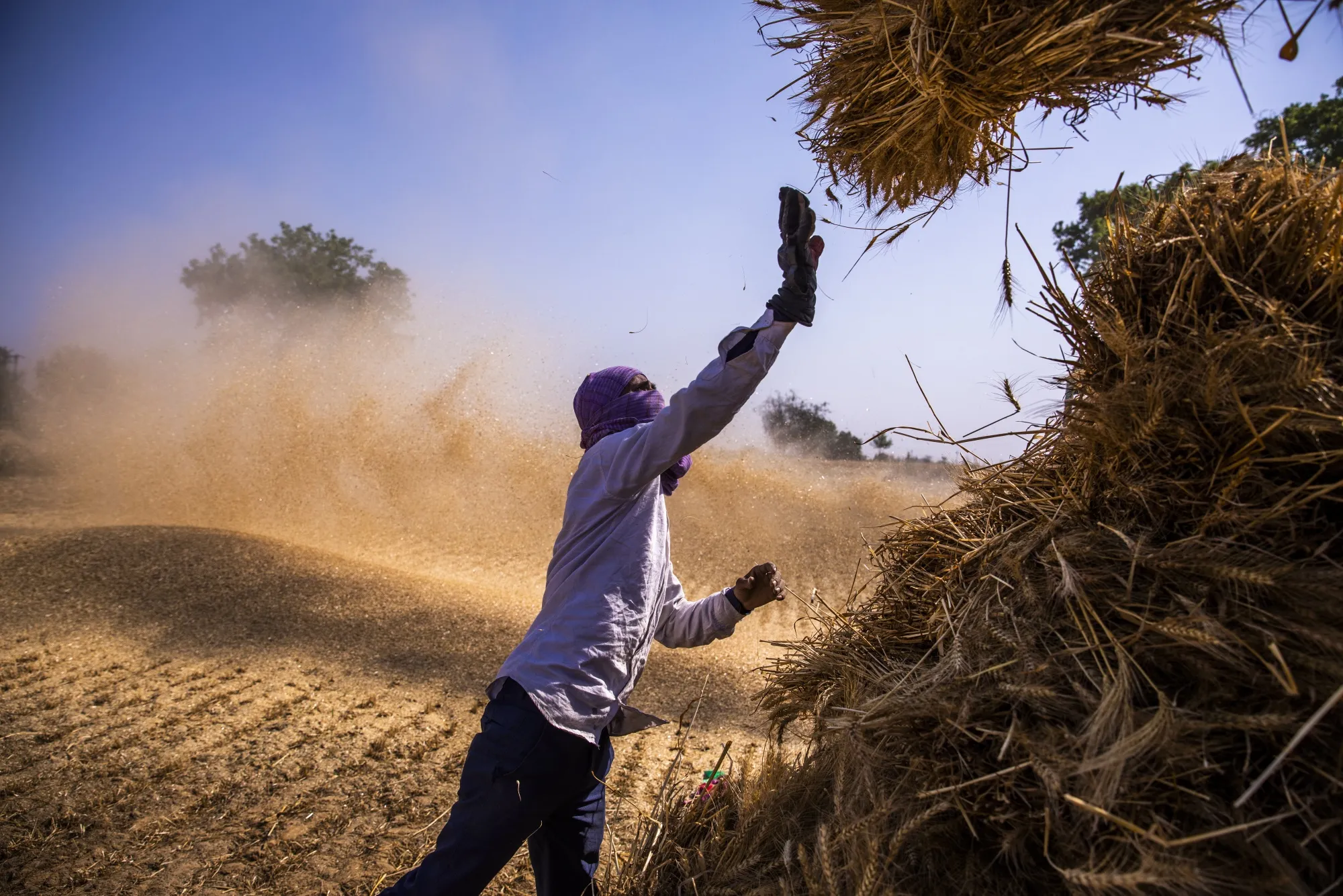 一位农民在印度北方邦布兰德沙尔区于4月21日扔下了一捆割好的小麦。
