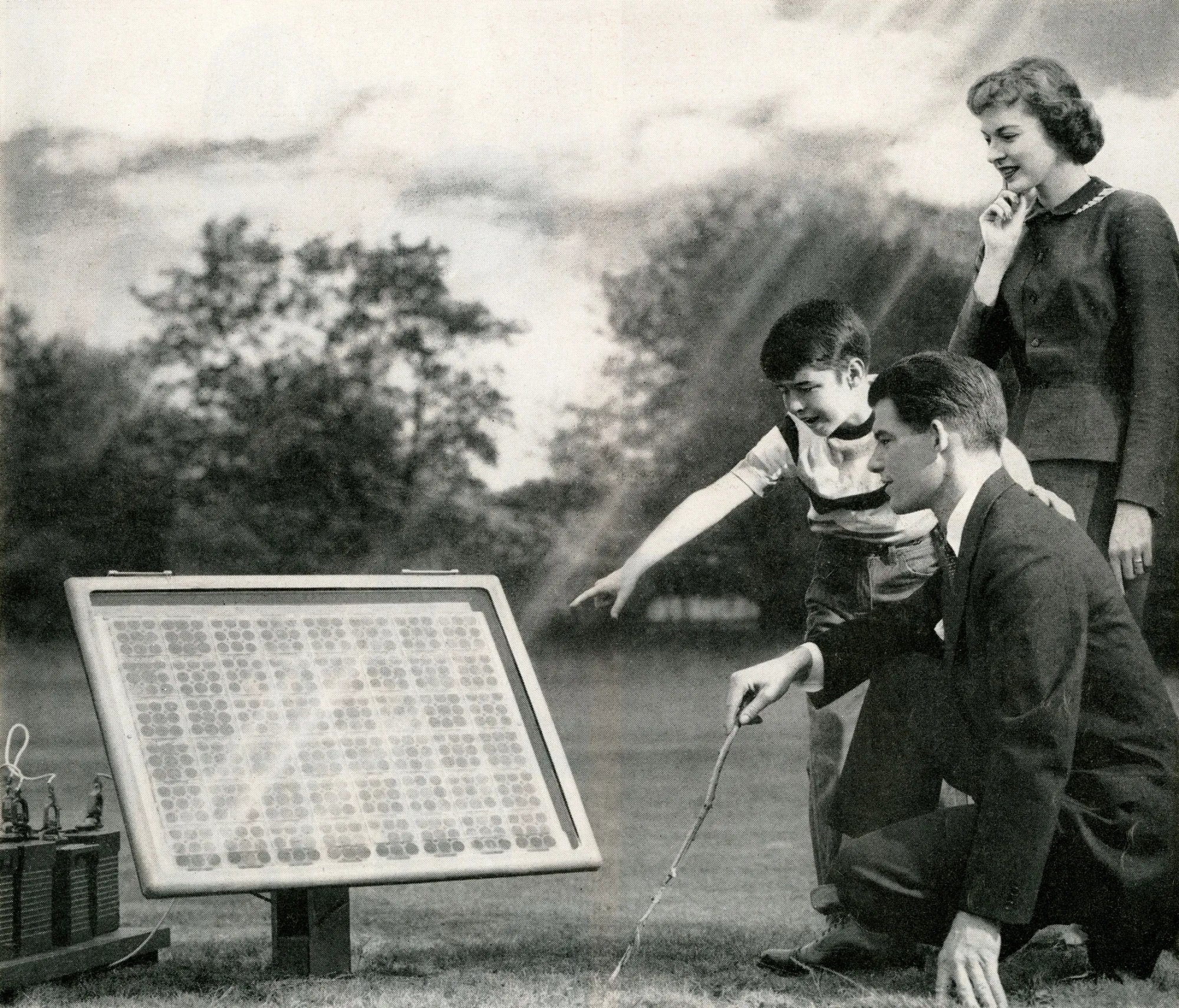 1956年的一则印刷广告展示了一个家庭在户外欣赏早期的太阳能电池板和电池。摄影师:Getty Images这一切始于第一个地球日之前的16年,即1954年,当贝尔实验室首次推出了光伏电池。他们称之为“太阳能电池,”而它的广告也很迷人。“同样温暖的阳光帮助花朵、谷物和水果生长,”其中一则广告写道,“也为我们提供几乎无限的电力。”但早期的营销也包含了强烈的现实主义:“在电池在电话和其他用途上的潜力完全开发之前,还有很多工作要做。”