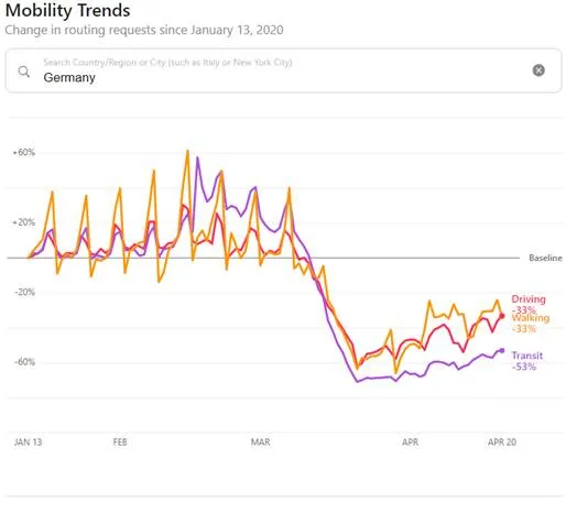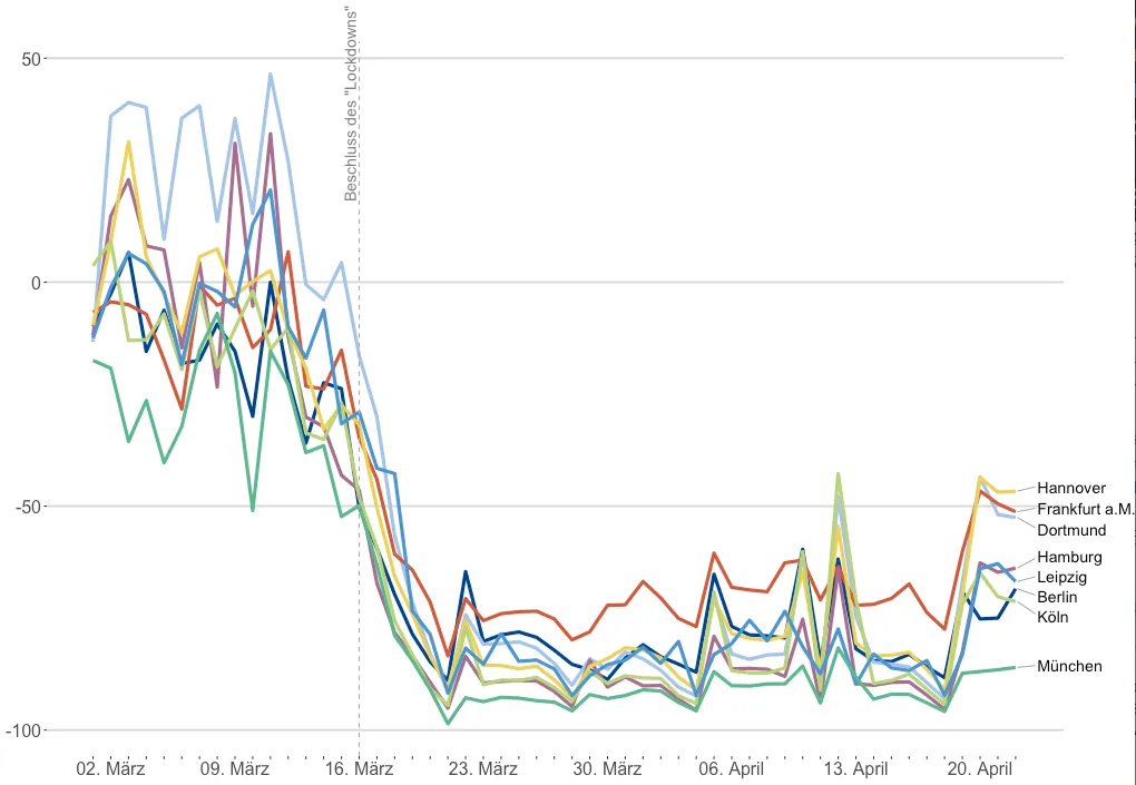 图表显示了德国城市在封锁期间,行人数量与预期的变化情况。