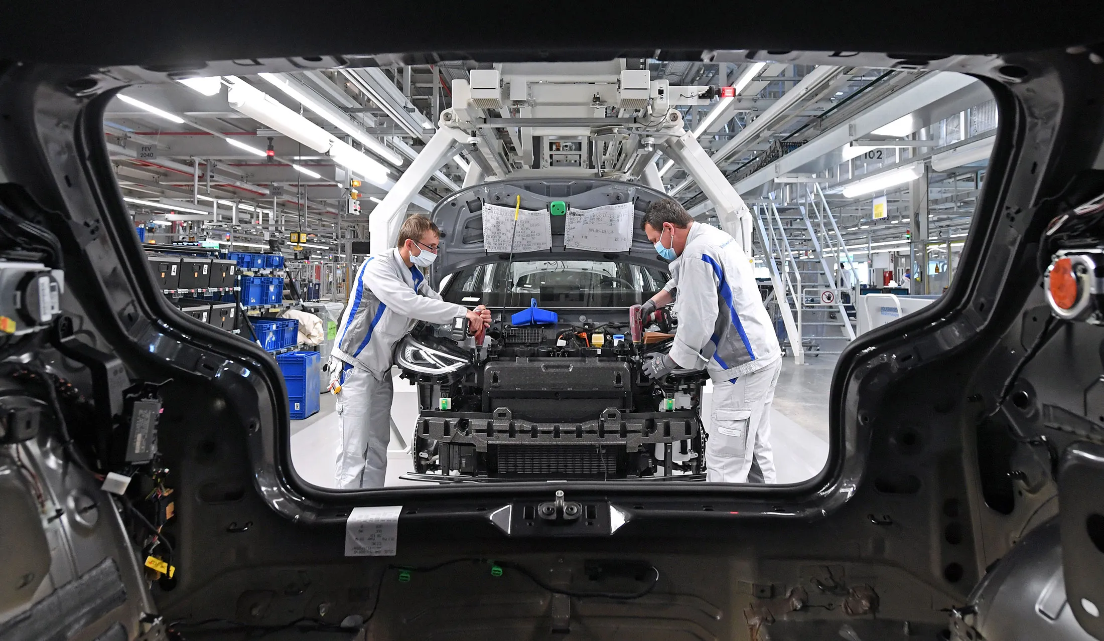 工人在德国茨维考的大众汽车工厂组装大众ID.3电动车时佩戴口罩,时间是4月23日。