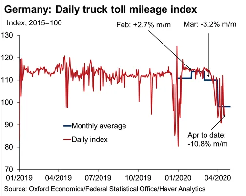 该图表显示了德国道路上卡车的数量——这是对行业供应链运作情况以及柴油/汽油消费变化的一个代理指标。