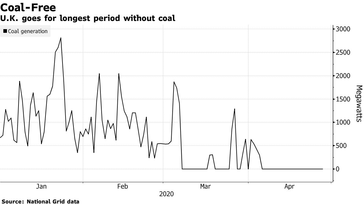 根据国家电网公司的数据,该国周二进入了第19天没有在发电厂燃烧煤炭。英国创纪录的太阳能发电在本月保持了化石燃料的输出,因为封锁措施使工业和商业基本关闭。