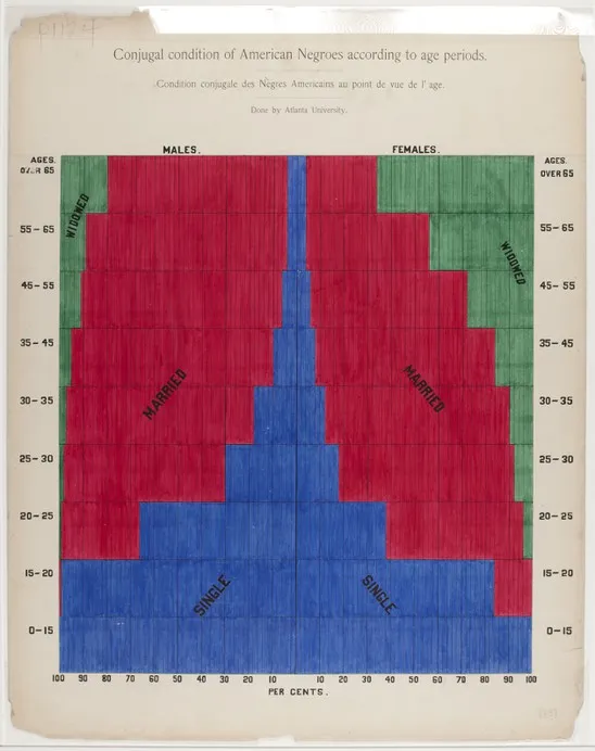 “根据年龄阶段的美国黑人婚姻状况。”由亚特兰大大学的学生准备,W. E. B. 杜波依斯收集,约1900年。感谢国会图书馆印刷和摄影部。当全国各地的博物馆关闭时,纽约和旧金山的策展人也不得不将他们的工作转移到线上——这意味着他们现在面临着在数字鸿沟中吸引人们的相同挑战。两者都感到有能力应对这一任务。即使在旧金山市长伦敦·布里德的居家令之前,YBCA就已经在考虑如何将城市中最难统计的20个 社区纳入这样的项目,因为他们知道,那些本来就对公共空间感到更恐惧的人在全球疫情期间可能会更加不愿意访问博物馆。