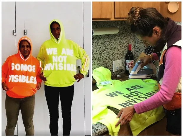 在博物馆临时关闭之前,艺术家阿琳·科雷亚·巴伦西亚和安娜·特雷莎·费尔南德斯一直在为旧金山人准备印有“We Are Not Invisible”和“Somos Visibles”的霓虹卫衣,这些字句以反光的热转印字母闪闪发光。他们原计划在城市中进行宣传,并在YBCA展示他们的商品。现在,他们正在制作视频教程,帮助人们缝制和组装自己的高对比度衣物和口罩。
