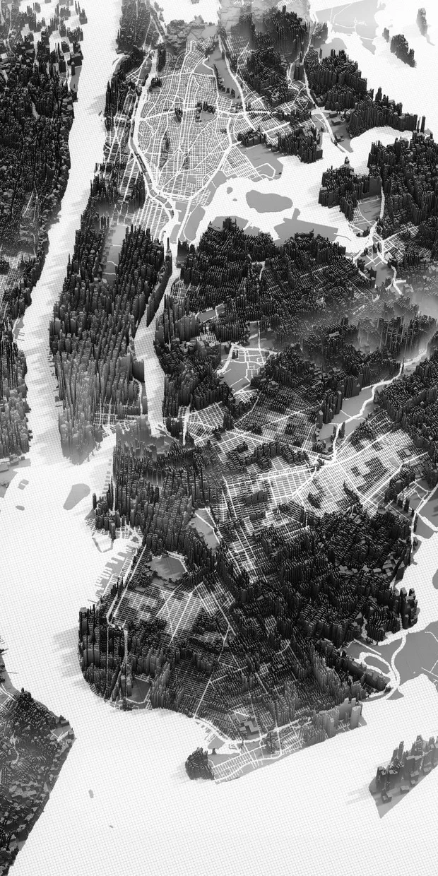 Art+Action的“来参加你的普查”公共媒体活动,在旧金山展开。感谢YBCAMCNY的展览向纽约的地形致敬。通过地图,这座城市通过其移民模式重新定义(由一个巨大的彩色树干所代表的不断扩大的环),以及其语言(被普查压缩成不精确的类别,如“非洲语言”,并以刺眼的颜色可视化。)收入差距变得结构性,在Herwig Scherabon的地图中,家庭富裕的高耸柱子相互挤压并隔离。