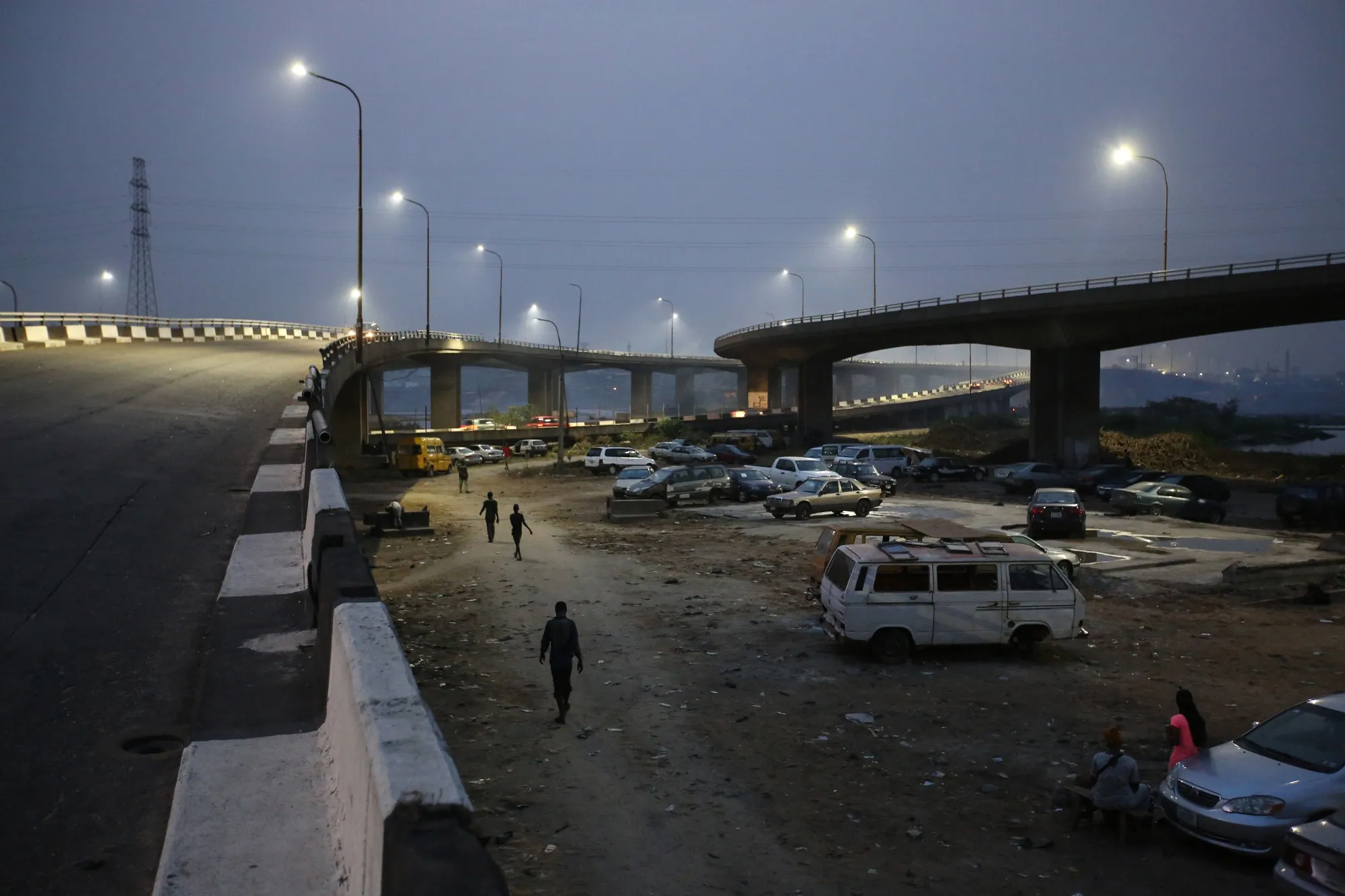 居民在夜幕降临时走过尼日利亚拉各斯的一座公路桥。
