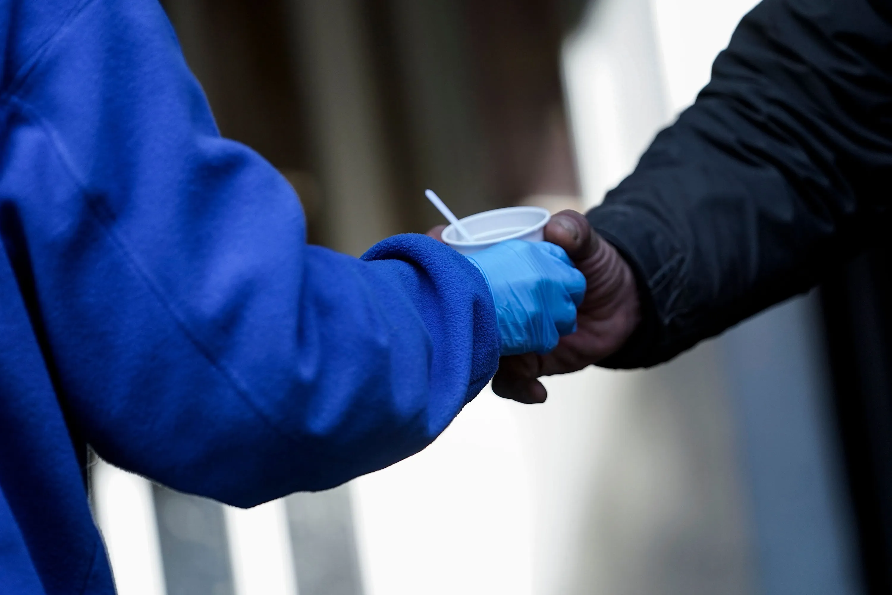 一名穿着防护手套的人在布鲁塞尔的一个一次性杯子里倒咖啡,时间是3月26日。