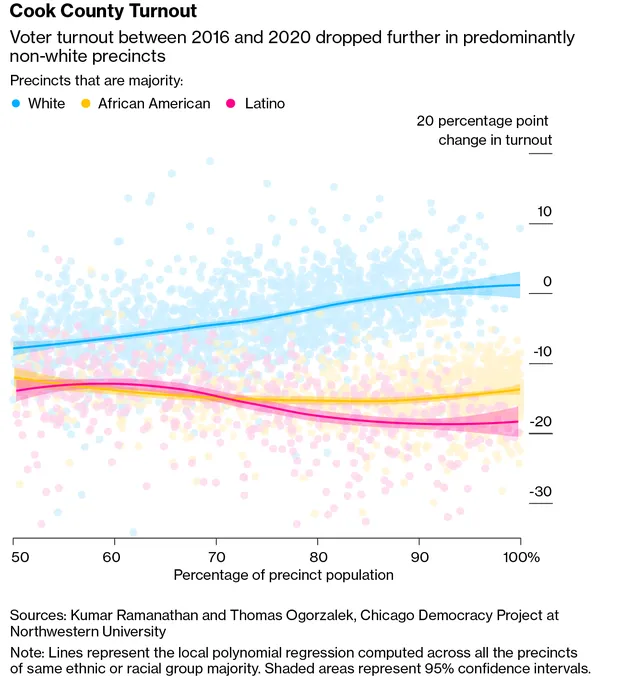 我们发现,在3月份芝加哥的投票率存在种族差异,这在居家令之前,但[在]学校已经关闭之后。我们发现,芝加哥的白人家庭以及库克县郊区的投票模式要么保持不变,要么有所增加。对于非裔美国人来说,投票率下降了。而对于拉丁裔公民来说,下降得更明显。我们实际上不知道是否存在直接的联系,因为我们需要进一步研究。但并不是说非裔美国人认为这次选举不重要。我认为他们知道这很重要。但他们能够以一种安全的方式动员去投票的能力,我认为与白人感知的方式是不同的。