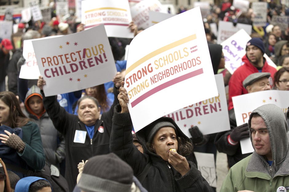 成千上万的抗议者在2013年集会反对芝加哥关闭54所主要位于黑人和拉丁裔社区的学校的计划。约翰·格雷斯/科比斯通过盖蒂图片社在2013年,芝加哥和费城共同关闭了创纪录数量的公立学校,导致超过20,000名学生流离失所,其中90%是低收入的非裔美国人和拉丁裔。家长们积极反对这些学校关闭,表示这摧毁了社区的支柱机构,同时让他们的孩子感到被低估。但学区并未受到影响,引用了财政压力、低入学率和差劲的学业成绩。