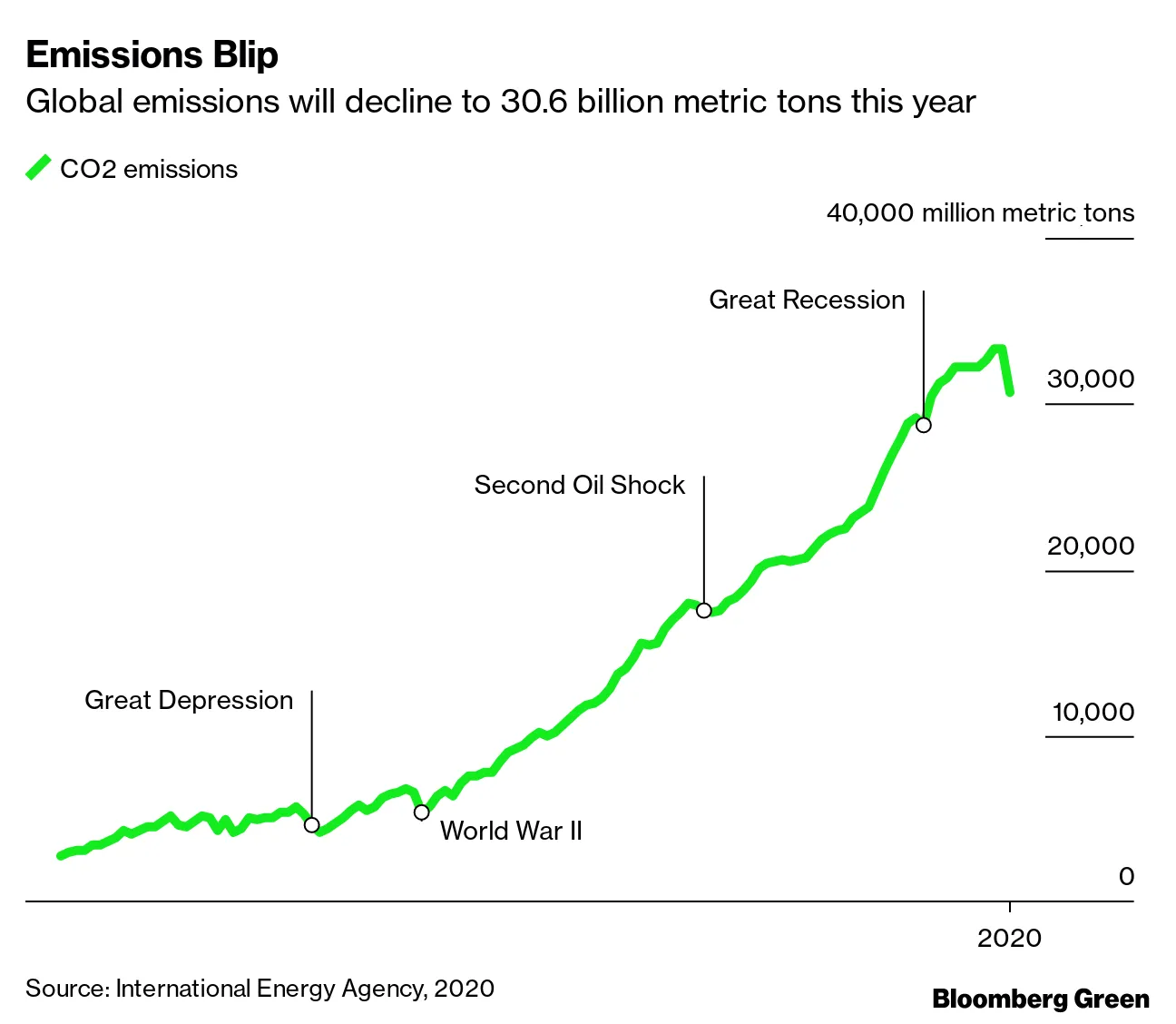 而在全球病毒封锁期间不会排放的26亿吨二氧化碳呢?它们与今年将排放的307亿吨相比显得微不足道。疫情引发的短暂波动远远不够来阻止全球变暖,或是过去几十年在大气中积累的温室气体存量。