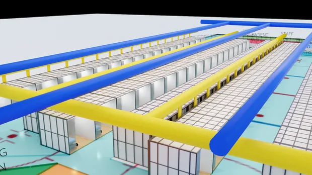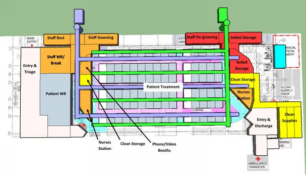 医院床在冰场上的一种可能设计。由肯尼·史密斯提供史密斯表示,对于加拿大来说,冰场是最合适的选择,因为这些场馆的结构通常是这样的。大多数冰场有五个固定的门口:主入口、冰车入口、机械室入口和两个消防出口。这些将用于为患者、医疗专业人员和物资创造安全的流通。主冰场区域将作为患者治疗设施,地面将覆盖卷材乙烯基材料,并在上面焊接胶合板基材。这可以保护地面不被冰场表面的冷却线刺穿,同时确保清洁和感染控制程序能够得到遵守。一个冰场可以容纳90到100张床,分布在预制的模块化舱内。每个舱将有三个坚固的隔断、一个天花板和一个有帘子的入口。
