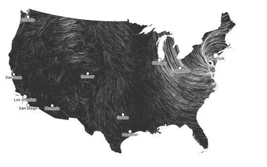 这个领域刚刚爆炸性增长。过去,制图是政府和一些出版地图的私人公司的专属领域,这意味着我们收集的地图数量有限,但通常更准确。现在,许多令人惊叹的制图作品来自坐在办公室、咖啡馆和家里的人们,他们以早期制图师无法想象的方式可视化地理空间数据。有时出现的地图让你惊叹不已,比如这个 风图。它正好象征着现在制图的样子:利用地理空间数据以动态方式可视化世界。