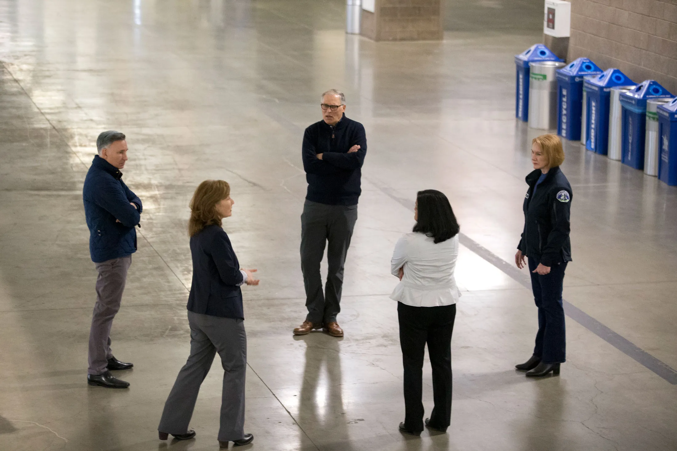 金县执行官道·康斯坦丁、国会议员金·施赖尔、华盛顿州州长杰伊·英斯利、美国国会议员普拉米拉·贾亚帕尔和西雅图市长珍妮·杜肯在2020年3月28日的新闻发布会后会面。摄影师:凯伦·杜西/盖蒂图片社这让我们想到另一个相似之处。到目前为止,Covid的领导来自各州。各州能否在减少碳排放方面也发挥领导作用?