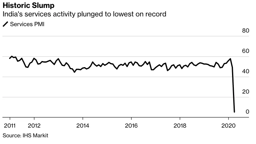 停下来片刻,惊叹于印度发布的服务PMI。作为提醒,采购经理人指数衡量经济制造和服务部门的动能。“50”水平是经济扩张和收缩的分界线,通常你会看到读数聚集在40和50之间。但在周二,印度报告了仅为5.4的服务PMI,令人震惊,因为它实施了全球最大的冠状病毒封锁。这是全球范围内记录的最低服务PMI数字。