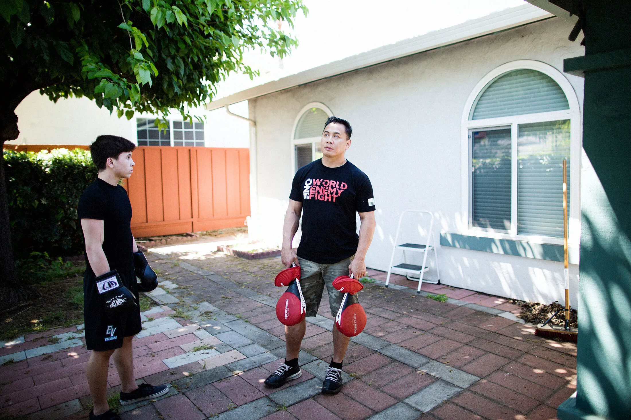 Le在他们的院子里训练他15岁的儿子安东尼。摄影师:塔莉亚·赫尔曼为《彭博商业周刊》拍摄Le表示,怀特不会是那些必须面对真实后果的人。在他的MMA生涯中,他四次骨折鼻子,肋骨骨折,进行了五次肘部手术、三次膝盖手术,以及超过100针缝合。他的手臂弯曲的程度没有达到应有的水平。