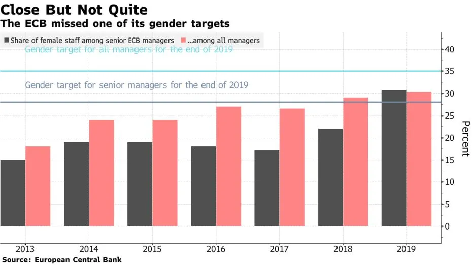 欧洲央行在去年年底达到了 女性担任高级管理职位的目标*,尽管未能达到所有管理者的目标。中央银行昨天的年度报告显示,30.8%的高级管理者为女性,而目标为28%。所有管理者的比例为30.3%,未达到期望的35%。*