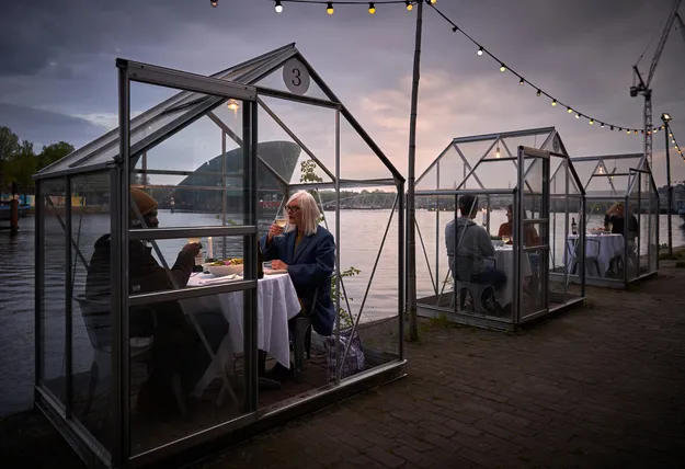 **6. 这四位女性创建了一个由2000多人组成的团队,为前线医护人员缝制工作服。**在英国,工作服一直短缺,而这个团队已 贡献 超过4000套工作服。**7. 这家位于阿姆斯特丹的餐厅正在测试他们的社交距离晚餐服务。**客人们坐在五个新安装的、温室般的 玻璃围栏内,称为“Serres Séparées”或“独立温室”。