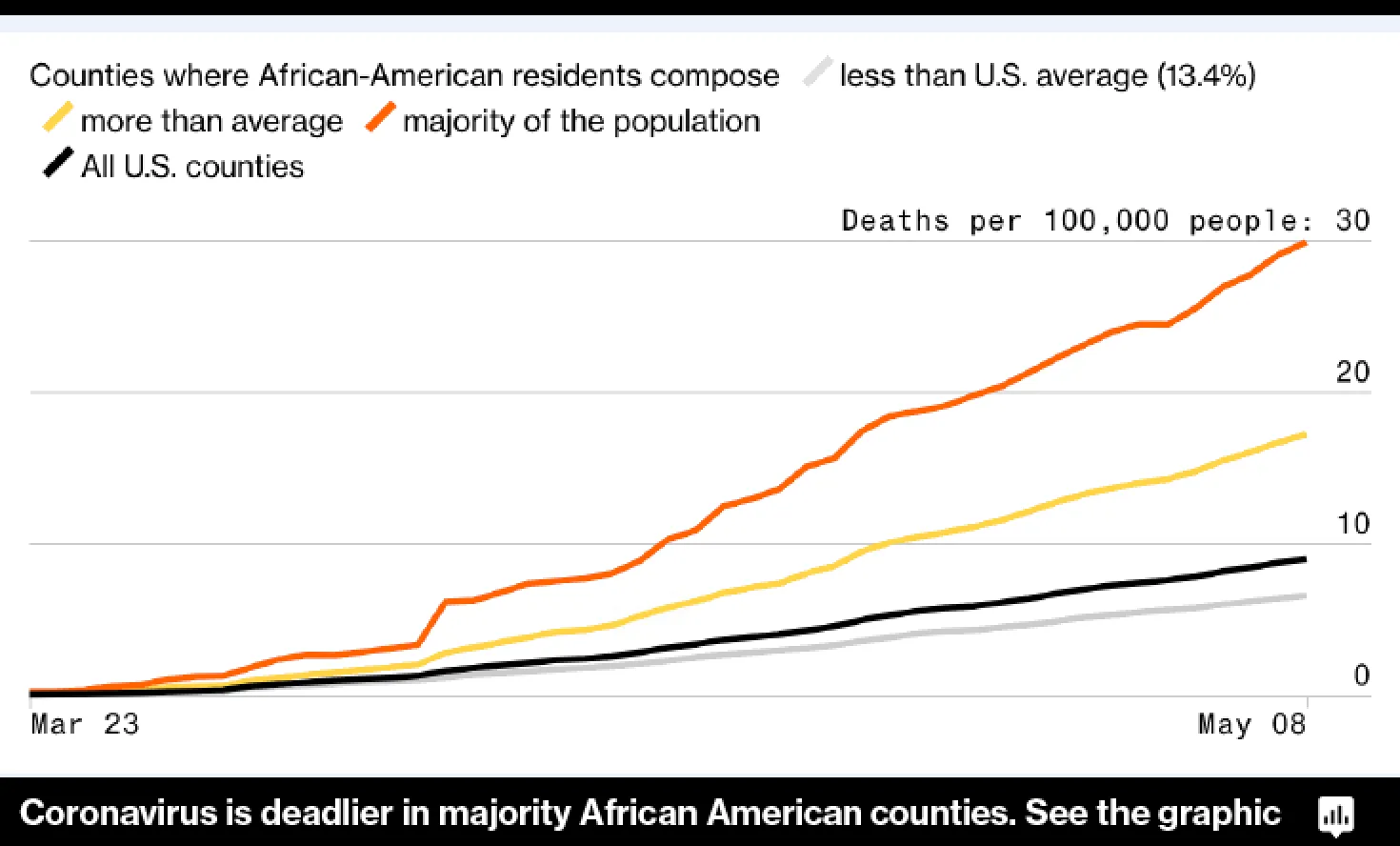 在大多数黑人县,冠状病毒的死亡率是全国平均水平的三倍以上,彭博新闻对约翰霍普金斯大学和人口普查局数据的分析发现。 查看完整细节。