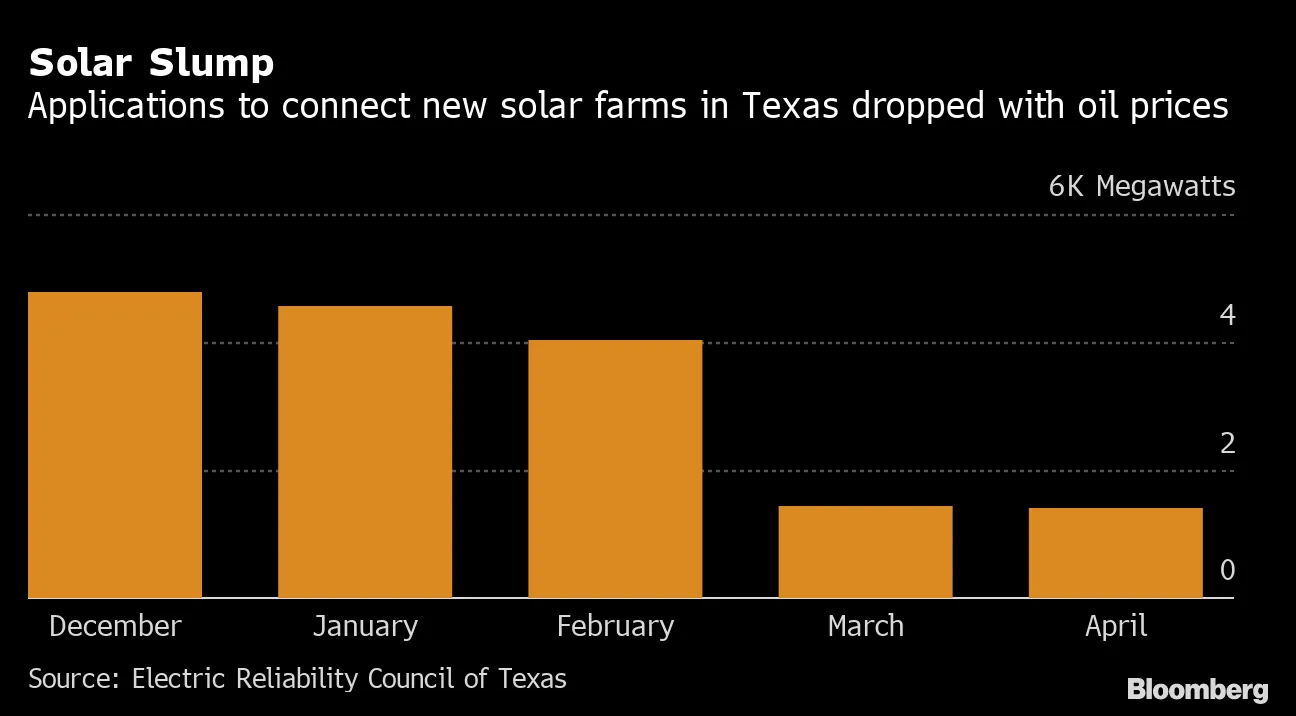包括8minute Solar Energy在内的开发商自3月原油价格开始暴跌以来,已取消在德克萨斯州建设至少13个太阳能农场的计划。分析师警告,可能会有更多项目跟随。