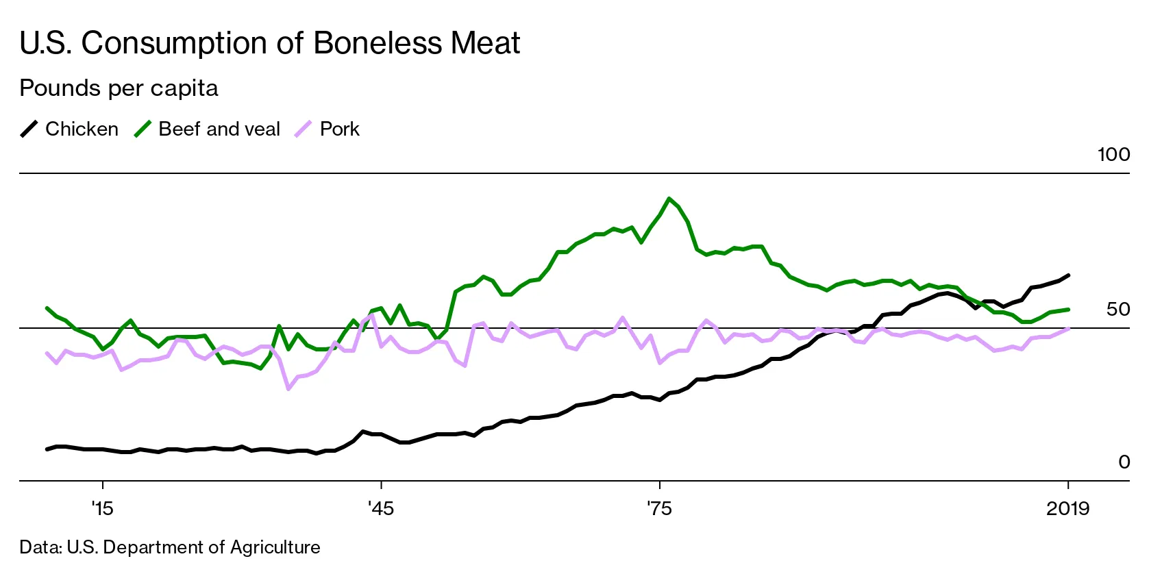 在美国,今年春季,由于全国屠宰场爆发冠状病毒,牛肉和猪肉价格高昂,且有时稀缺。鸡肉则保持广泛供应且价格便宜。这里’的原因。