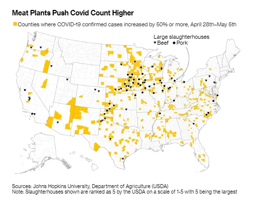 根据彭博新闻对约翰霍普金斯大学编制的数据分析,在唐纳德·特朗普总统发布行政命令指示重新开放肉类加工厂后的第一周,美国县的 主要肉类加工厂**的冠状病毒传播速度超过全国平均水平的两倍。