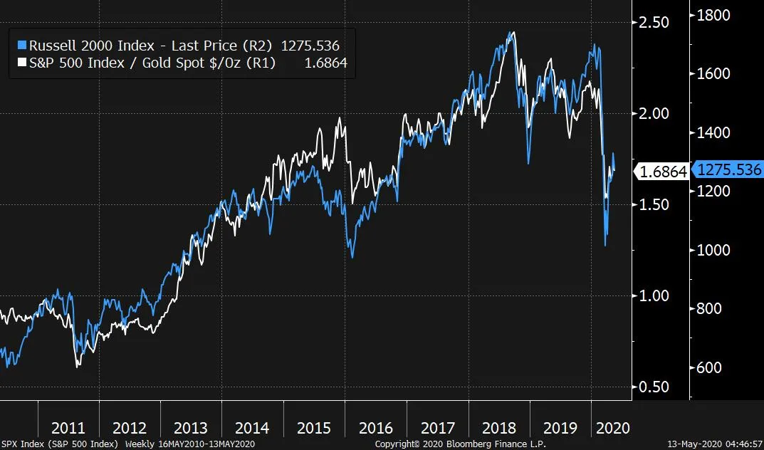 该图表在2000年达到顶峰,那时确实是全球乐观的巅峰。不仅仅是科技股,还有世界和平、世界贸易以及其他一切。然后,在恐怖主义、战争和金融危机的背景下,乐观情绪消退了十多年。比例在2011年底再次上升,那时美国房地产市场也开始反弹。还有一个有趣的地方——从事后看来很明显——是2011年开始的乐观周期并没有在3月初戛然而止。乐观周期在2018年中期结束。这是在减税(2017年底)和2018年初预算协议之后,这实际上大幅提升了支出。不仅股票/黄金比例在那时达到顶峰,罗素2000小型股指数也达到了顶峰,之后再也没有恢复到2018年的高点。股票/黄金比例与小型股的重叠图表令人震惊地一致。