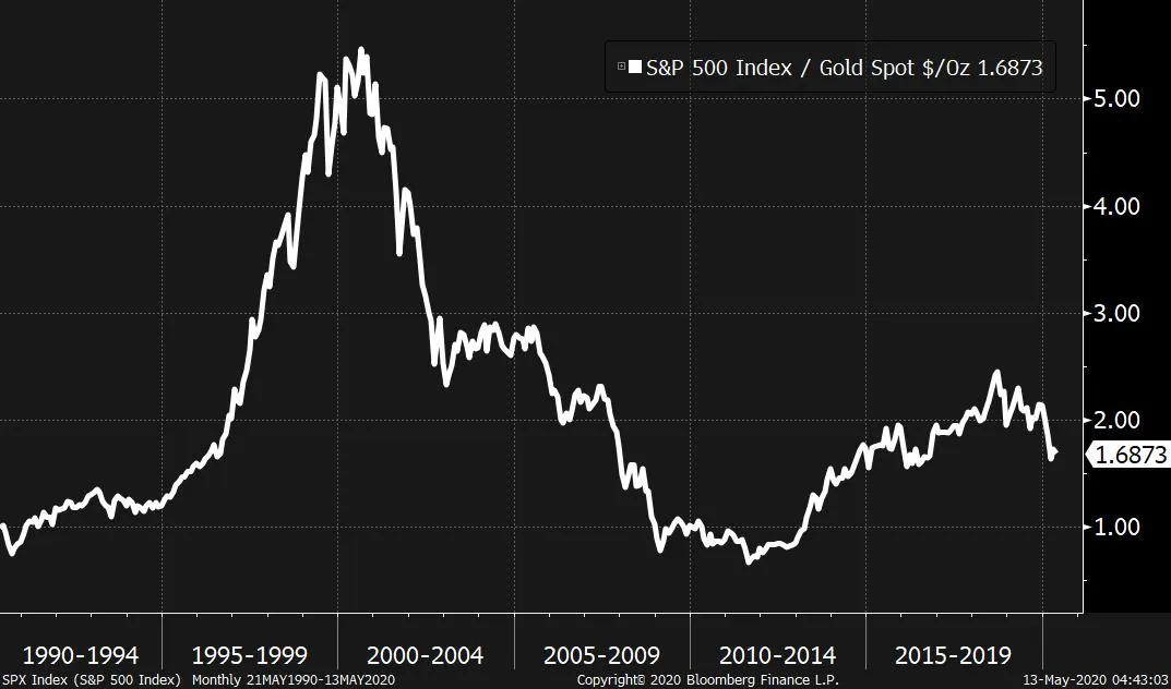我之前写过几次,但我一直是关注标准普尔500指数与黄金比例的粉丝。这是乐观与悲观之间如此纯粹和简单的表达。当你押注于股票时,你是在押注人类努力做有生产力的事情。当你押注于一种闪亮的惰性金属时,你是在押注一种闪亮的惰性金属。这是两者比较的长期图表。