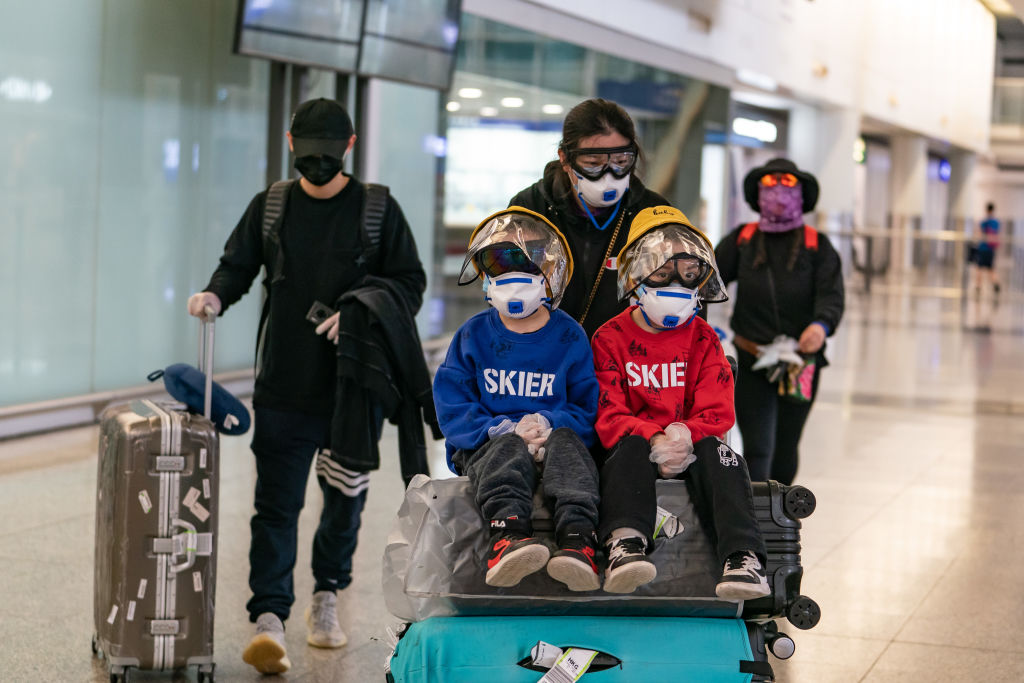 旅行者穿着防护装备于3月17日进入香港国际机场的到达大厅。
