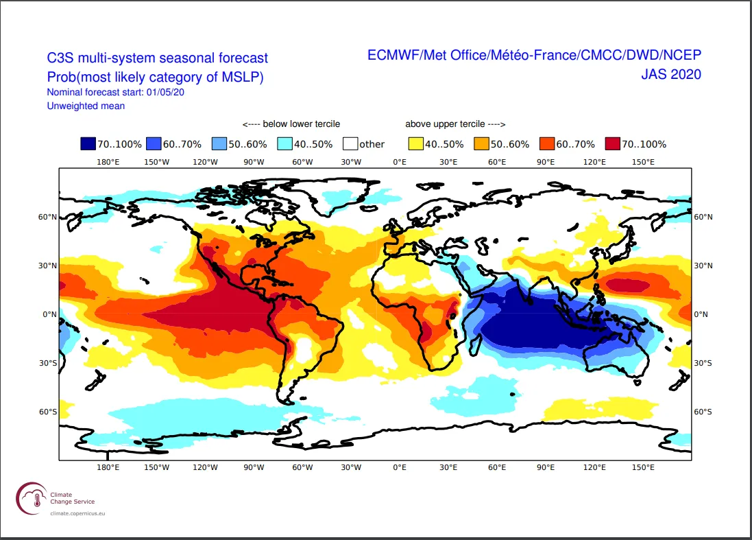 欧洲人不会是唯一感受到创纪录夏季高温的人。哥白尼预测,美国东海岸和西海岸的大部分地区在七月份将记录高于平均水平的温度,概率超过60%。