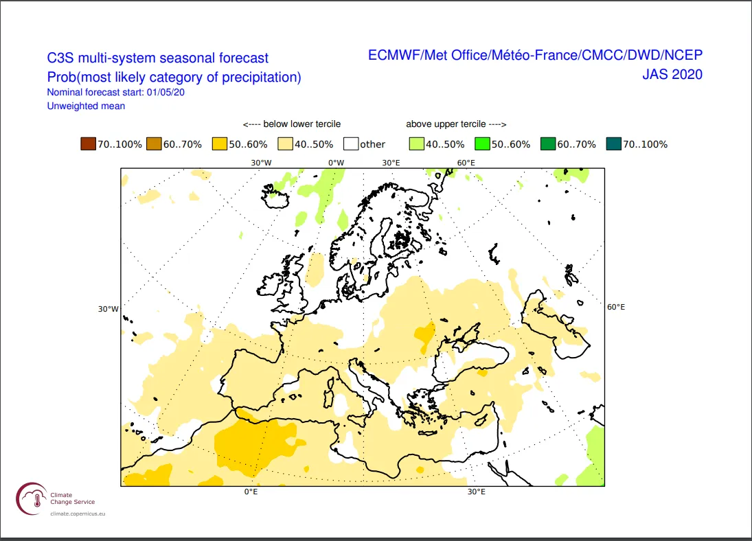 科学家预测,中欧、法国和西班牙的降雨量将低于正常水平的概率超过40%。
