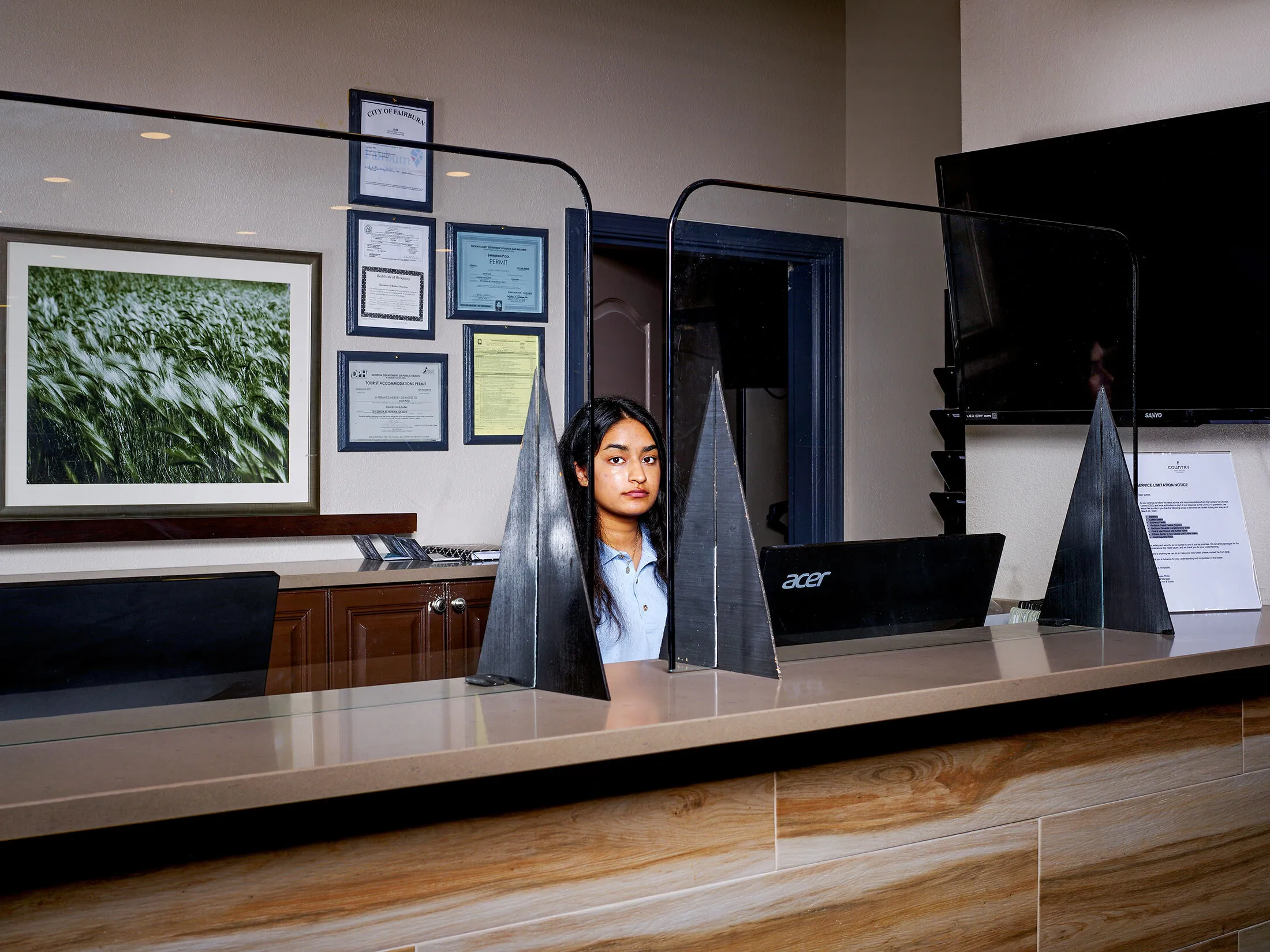 费尔本的乡村旅馆与套房的接待台。摄影师:约翰森·凯尔索为《彭博商业周刊》拍摄印度移民在1940年代开始大量抵达美国,作为农场的田间工人。扎根后,许多人开始自己创业。从加利福尼亚开始,他们开始开设汽车旅馆和经济型酒店——在短短几十年内,他们在这个行业中占据了主导地位。根据美国社区调查,截至2018年,几乎有7900名印度血统的人在美国担任住宿经理。